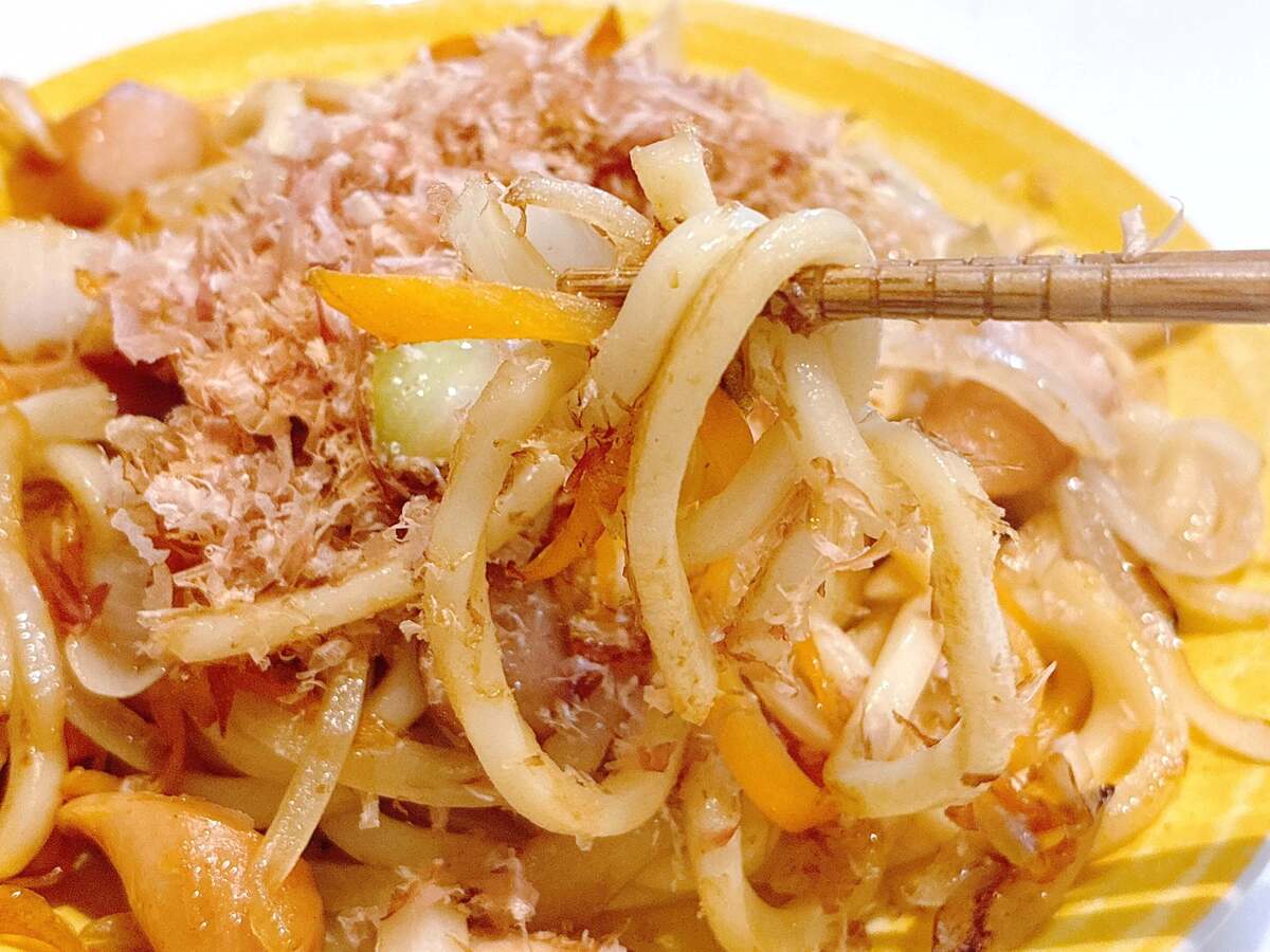 最近のお気に入りは、冷蔵庫の余り食材を使った「焼きうどん」。