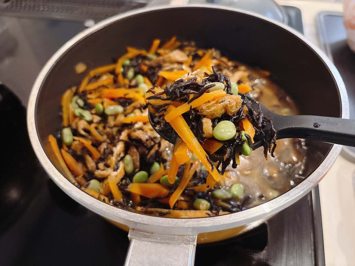 1袋すべて使うと、ひじきの煮物がこれだけ大量に作れます!5人家族でも2~3日は持つ量なので、副菜の作り置きにぴったりです♪