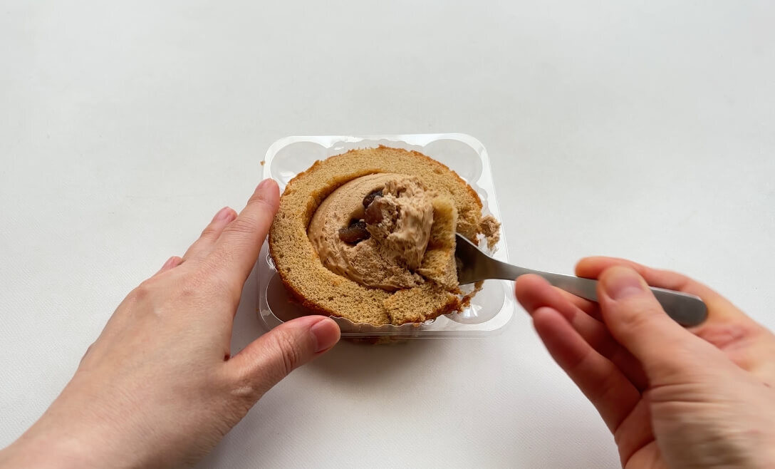 スポンジは焙煎大麦粉入りで、香ばしさがありつつ、ふんわり柔らか。 “ふんわりロール”の名前の通り、ほわほわ食感。