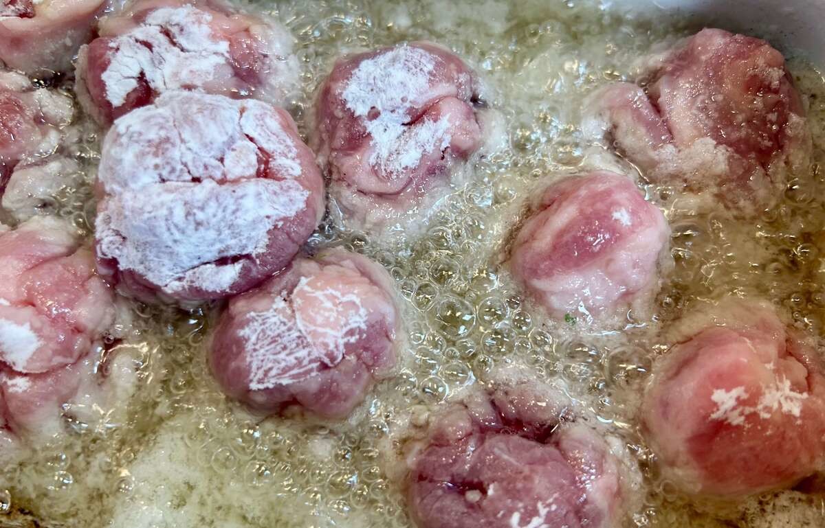 揚げ油を中温(170℃)に熱して、②を揚げます。ある程度火が通ってから触らないと形が崩れてしまうこともあるので、じっと待ってから転がしましょう。