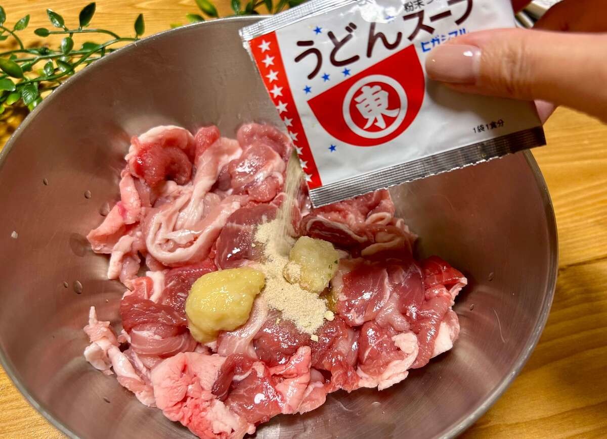 ボウルに豚こま切れ肉、すりおろしたしょうがとにんにく、酒、うどんスープを入れます。