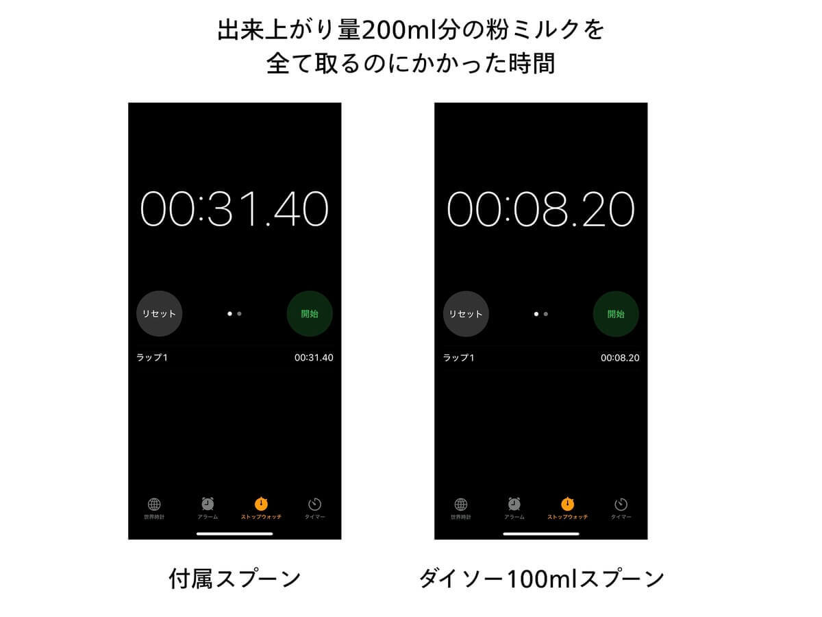 こちらは1回で付属スプーンの2倍、さらには5倍の粉ミルクを取ることができます。試しにどれくらいラクになるか、時間を測ってみました。