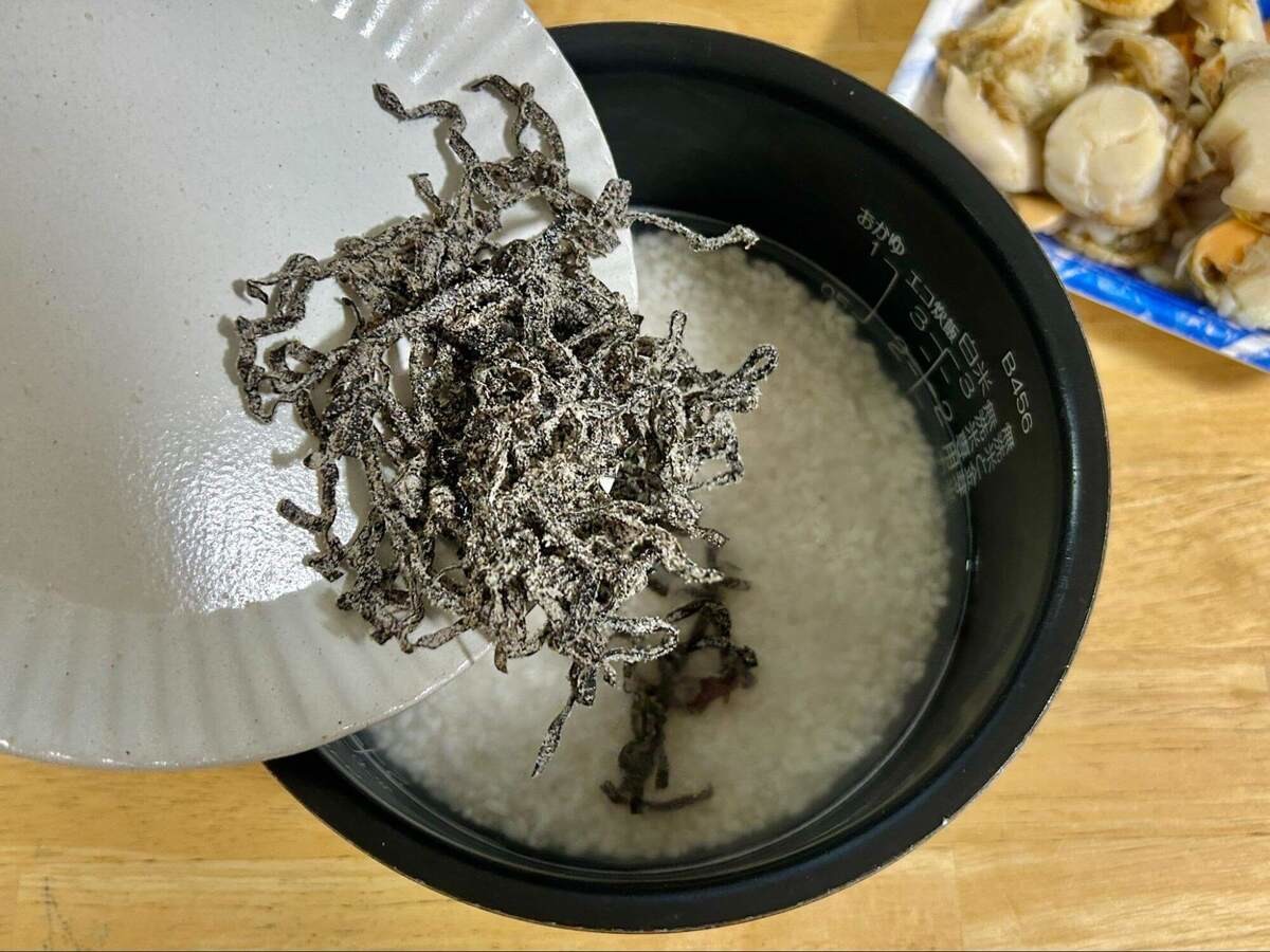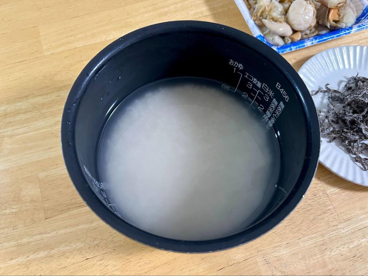 釜の中にはホタテたっぷりの状態に。炊飯前からなんだかワクワクします。