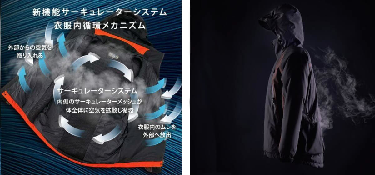 作業服で培われた防水素材や撥水素材と、新機能サーキュレーターメッシュの組み合わせによるハイブリッド機能でお客様より高い評価を受けたことで、発売後約2ヶ月半で累計3万枚の販売という驚異的な実績に繋がっているんだそう。