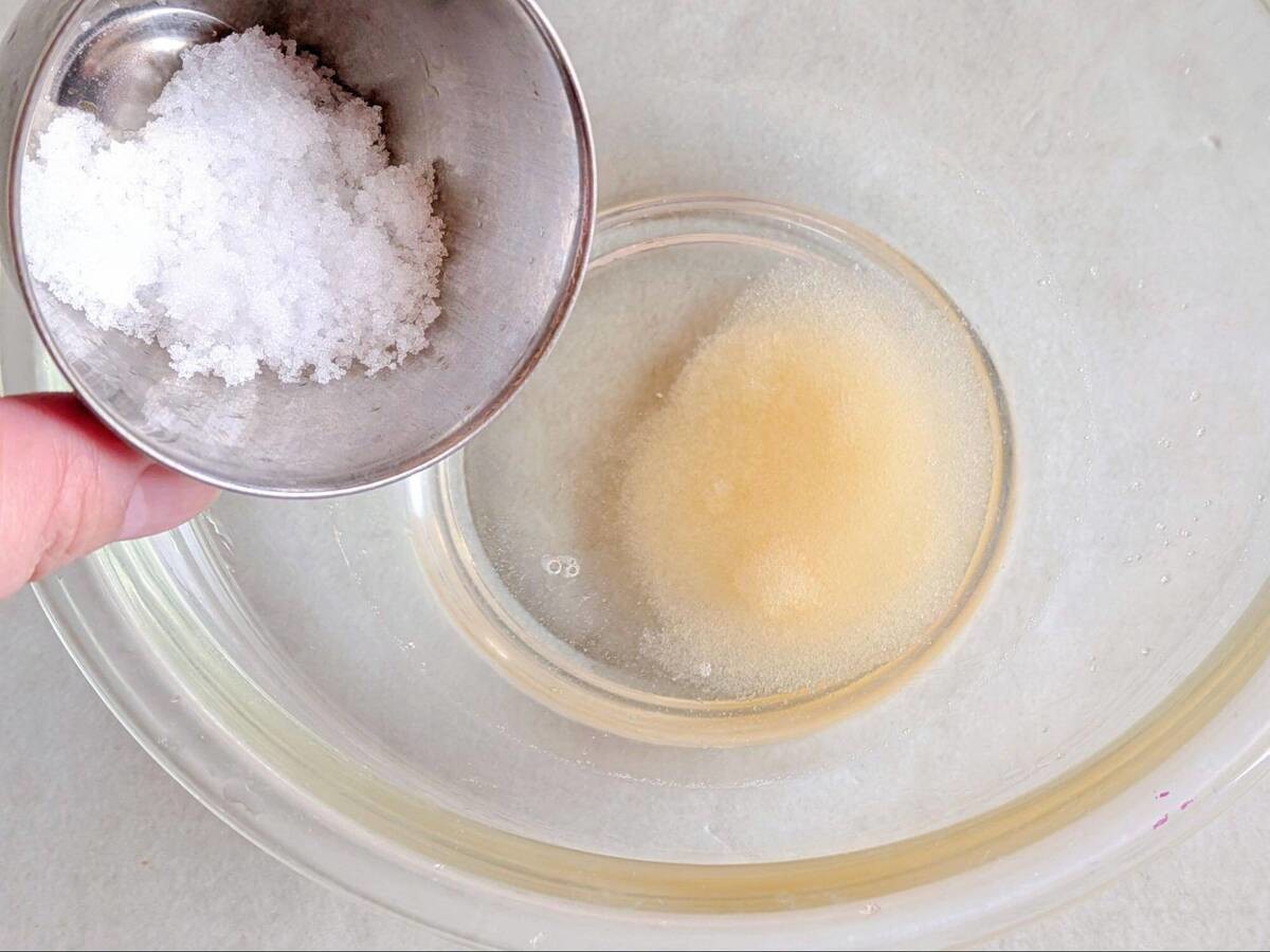 ボウルに水を入れ、塩、砂糖を加えてよく混ぜます。