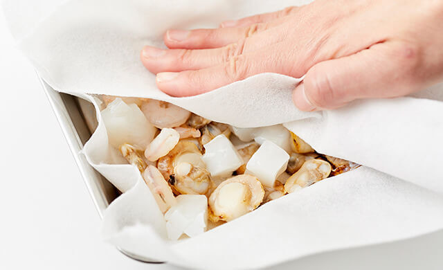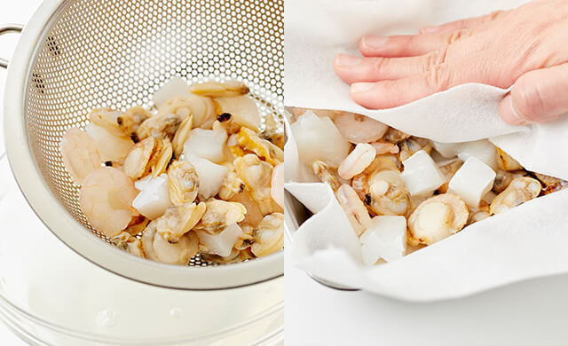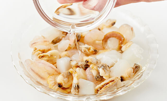 水気を拭き取ったシーフードミックスに日本酒を少量ふりかけて5分ほどおくと、取りきれなかった臭みがアルコール成分と一緒に揮発します。