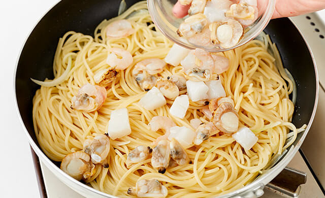 塩をしっかり溶かしてからシーフードミックスを入れましょう。