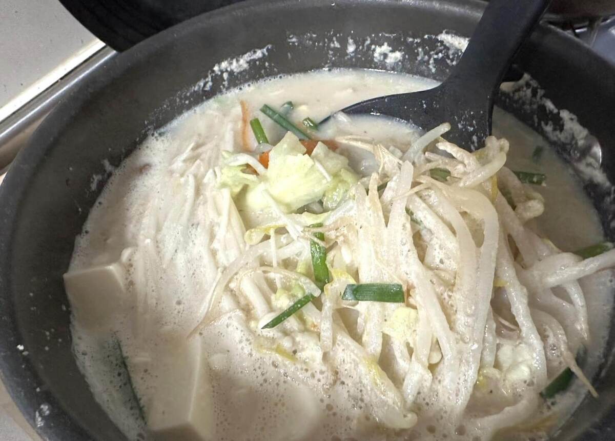 豆乳ベースにごまの香りが重なり、どこか外食の鍋セットのような雰囲気があります。