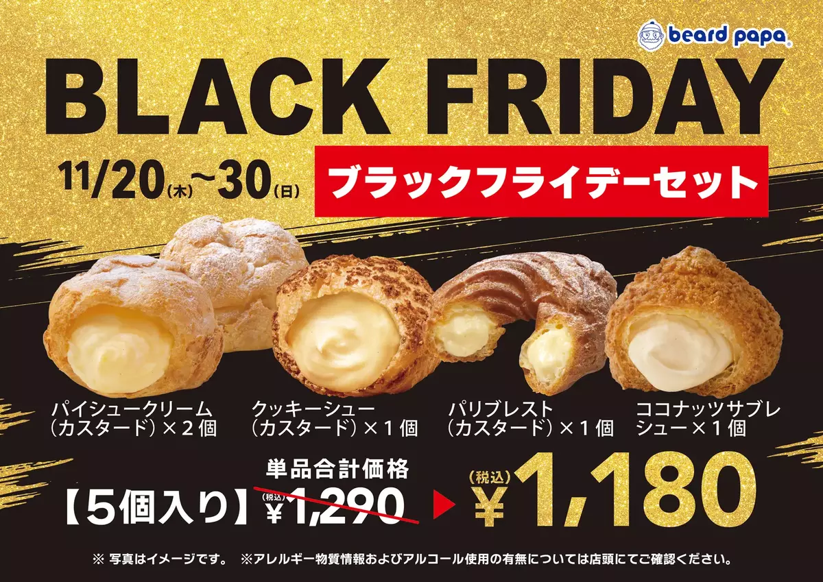 ブラックフライデーセットは、ビアードパパの定番商品“パイシュークリーム(カスタード)”と“クッキーシュー(カスタード)”、リング型シュークリーム“パリブレスト(カスタード)”に加え、日清シスコ株式会社(本社:東京都台東区)の発売60周年を迎えたロングセラービスケット「ココナッツサブレ」とのコラボレーション商品“ココナッツサブレシュー”を組み合わせた、合計5個入りのセットを通常価格よりお得な1,180円(税込)でご提供いたします。