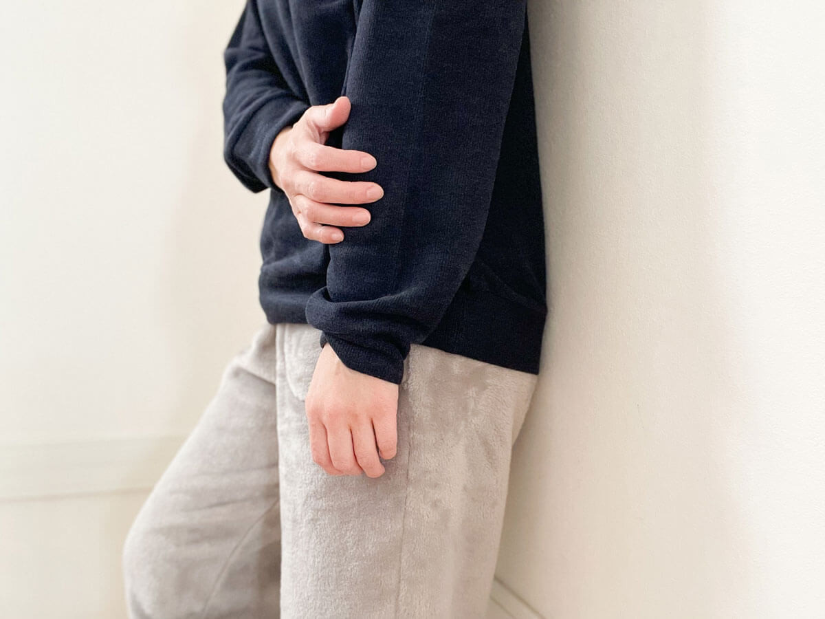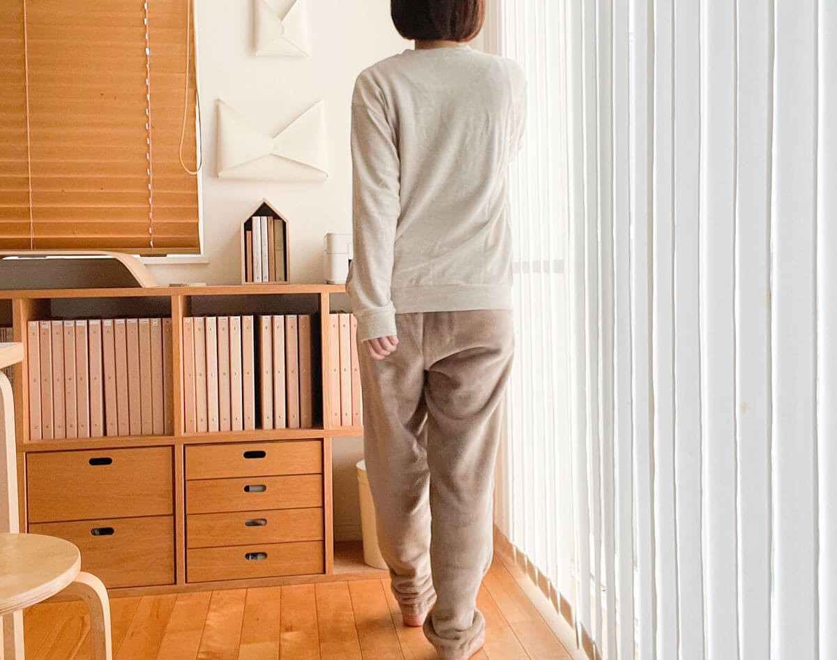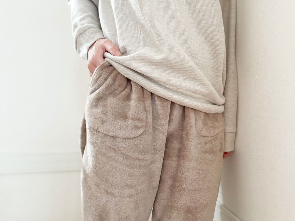上下とも、ぬくぬく素材でしあわせ。チクチクしない肌触りがストレスフリー。