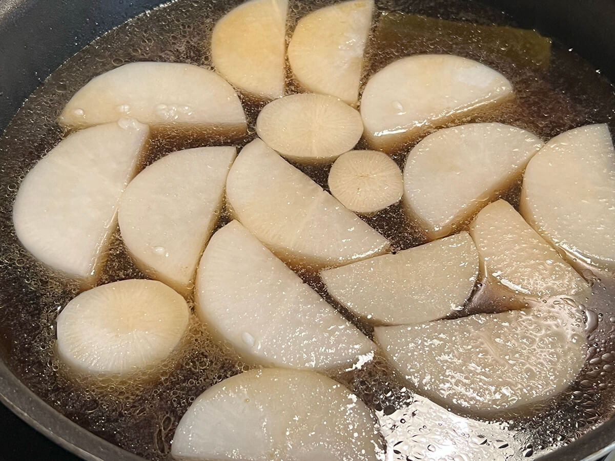 ブリを焼いた同じフライパンに酒、みりん、しょうゆ、砂糖、下茹でした大根と茹でた時に出た昆布出汁を大根が少し浸るくらい入れて蓋をし、中火で10分煮ていきます。