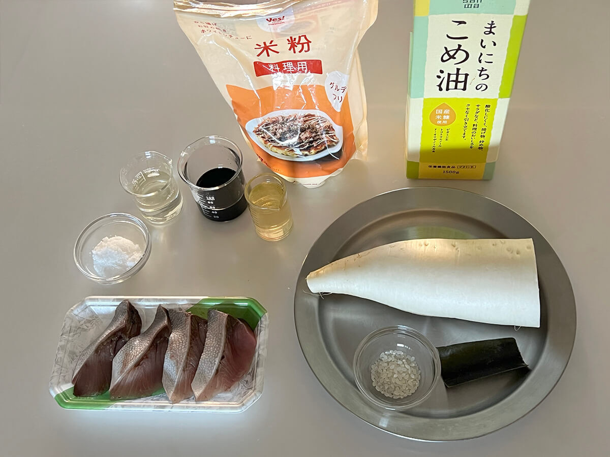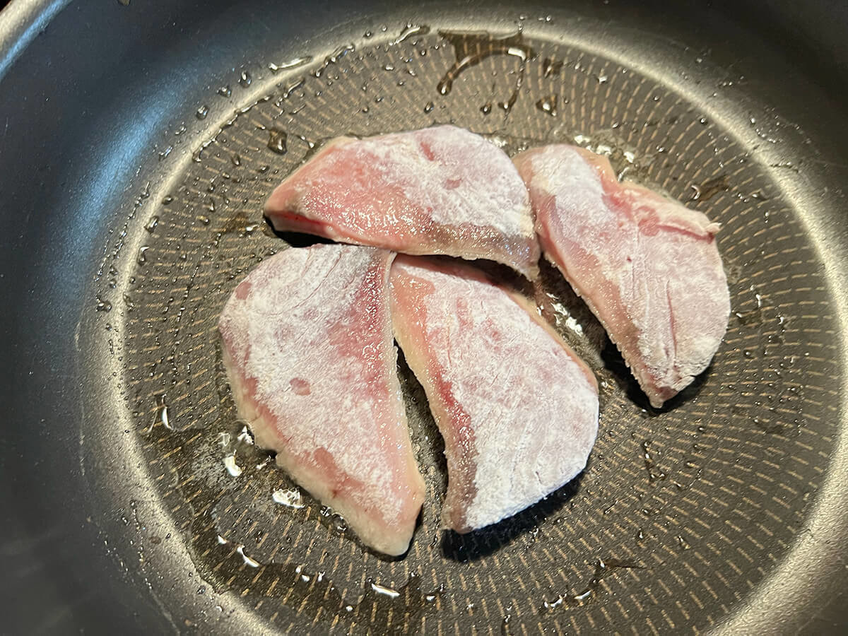 フライパンに米油をひき、ブリに米粉をまぶして皮→表面の順序で焼きます(中火)。
