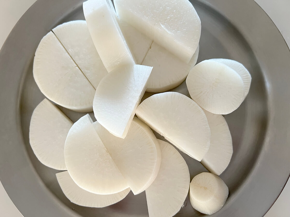 大根を2cm幅で輪切りにし、皮を剥き半分に切ります。