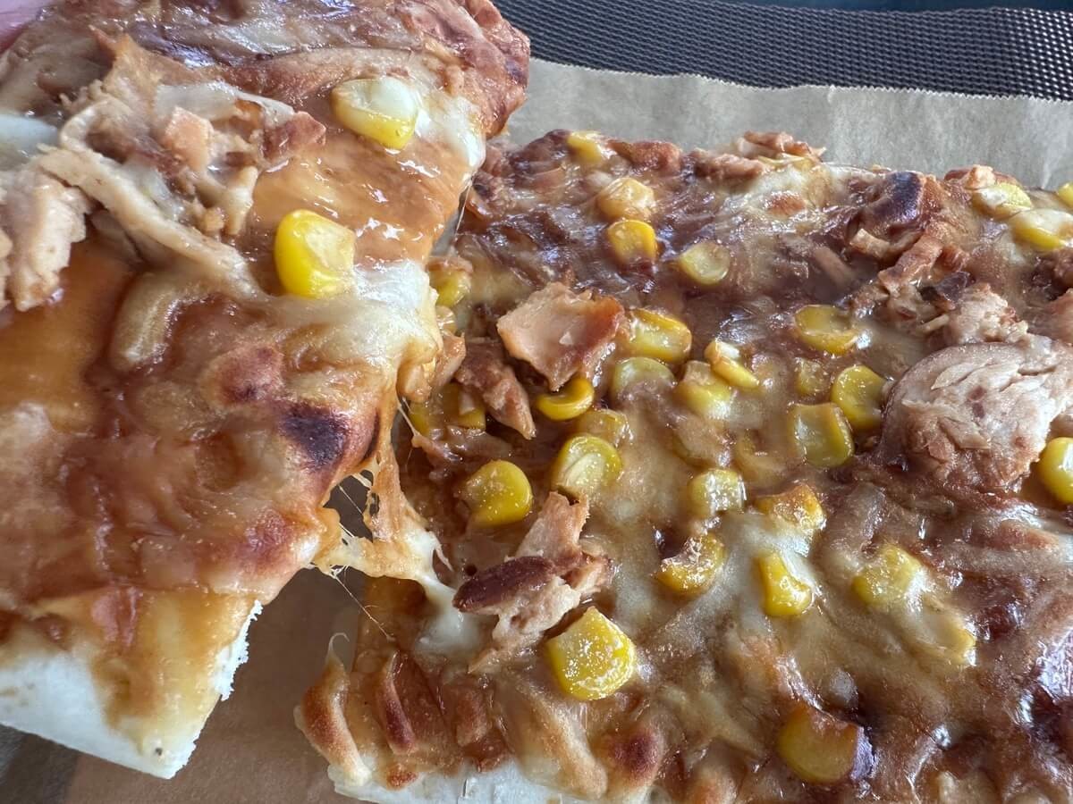 生地の上に鶏肉やチーズ、コーンがバランスよくトッピングされています。