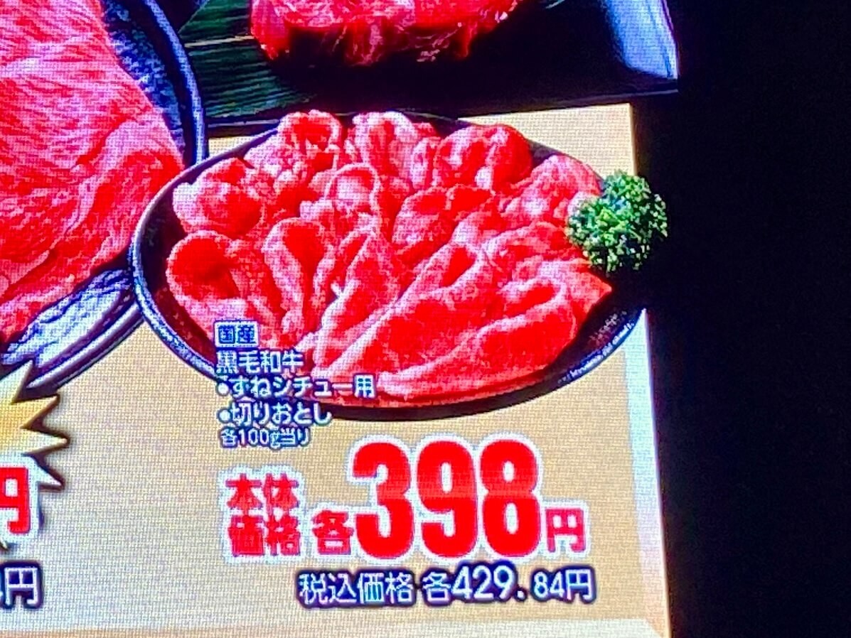 私の記憶では、これまで100gあたり645円が最安値でした(部位は忘れました、汗)。しかし今年はそれをさらに下回り、100g429円で「国産黒毛和牛切り落とし」と「国産黒毛和牛すねシチュー用」の2種類が登場!