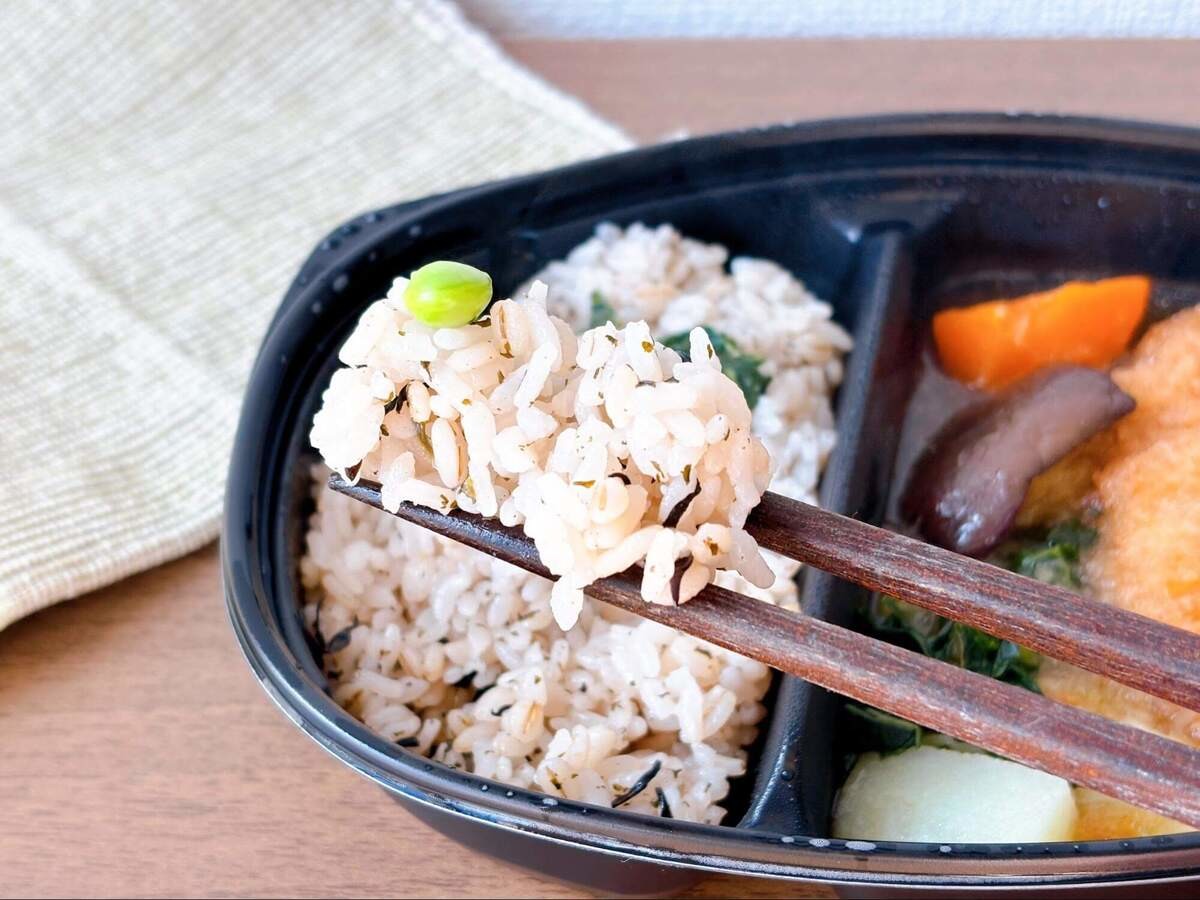もち麦のぷちぷち食感が楽しく、しその香りがふわっと鼻を抜けて後味もさっぱりしています。小盛なので、たっぷり食べたい人は自前でごはんをちょい足しするのがおすすめ。