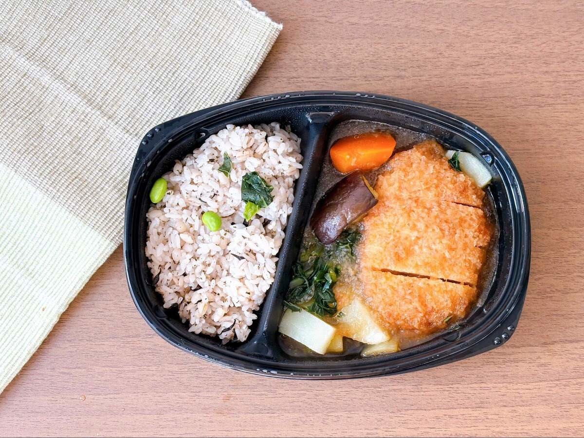 しっかりおかず・野菜・ご飯がセットになっており、トレー入りなので、食べ終わったあとの片付けも楽な商品。
