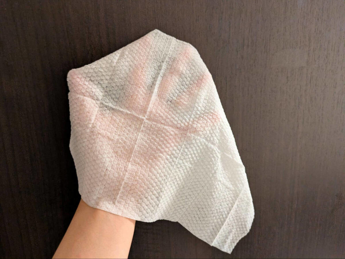 一般的なウェットシートよりもシートに水分が多く含まれている印象で、最初は多少濡れ感があっても気にならない場所から拭くのをおすすめします。