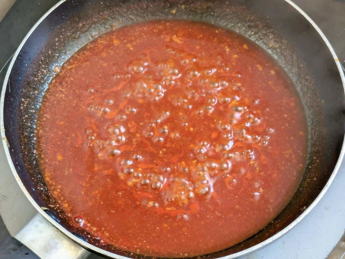 ケチャップとウスターソースを各大さじ2、バターひとかけ(分量外)を入れて、とろっとするまで煮詰めれば完成です。