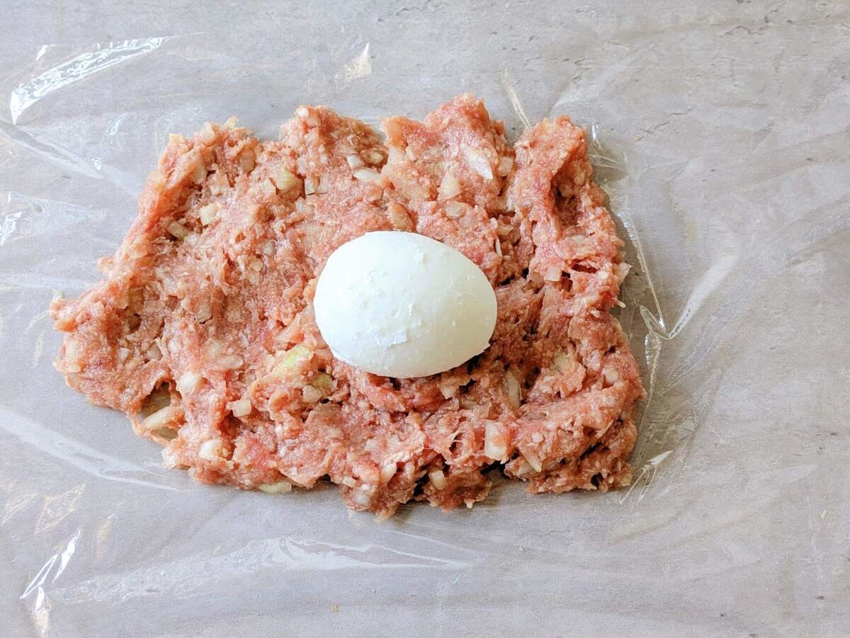 私はとにかく手を汚したくないので、ラップにハンバーグのタネを広げて真ん中にゆで卵を置いて包みました。