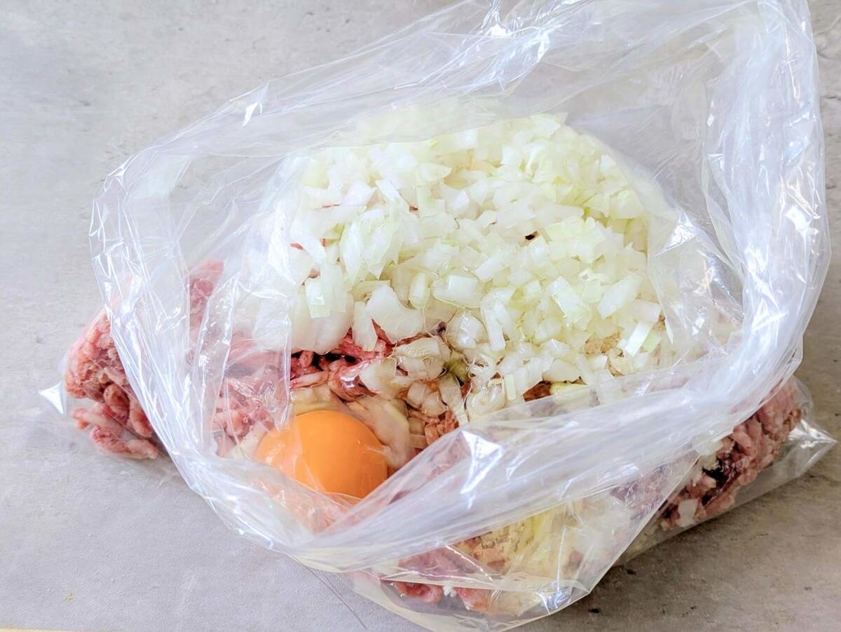 ポリ袋を使うので、ベッタベタなボウルを洗わなくて済む!ハンバーグ作りのハードルがちょっと下がりますね。