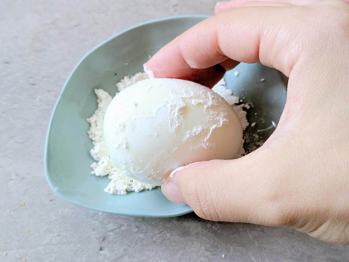 作り方③ゆで卵の殻を剥いて薄力粉をつける