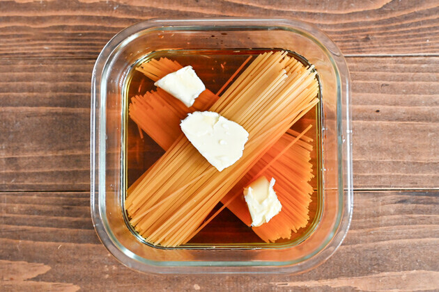 ※2回目のレンジ加熱をしたあとで、スパゲティにかたさが残っていたら、様子をみながら30秒ずつ追加加熱をしてください。