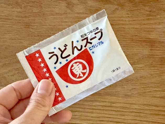 お湯を注ぐだけで簡単に出汁が効いた本格的なうどんつゆが作れる、ヒガシマル醤油の「うどんスープの素」。