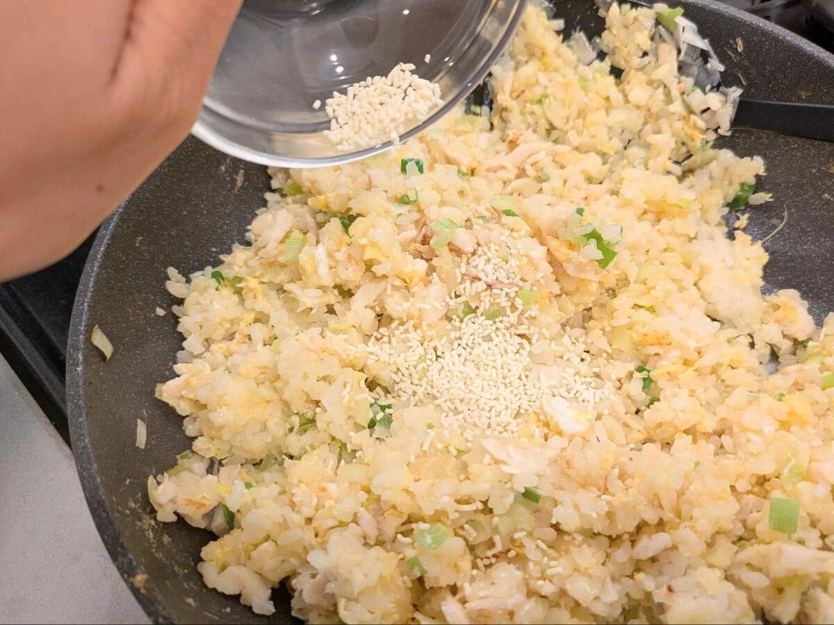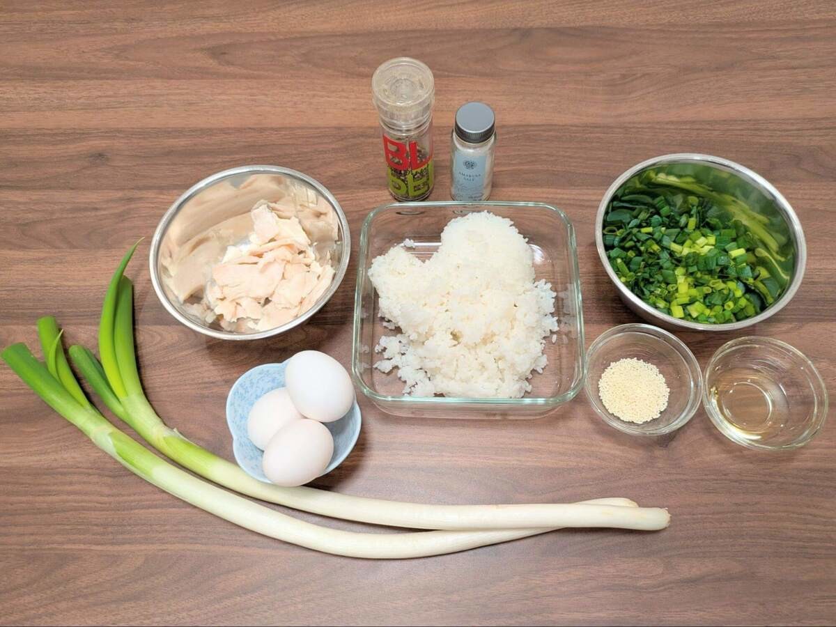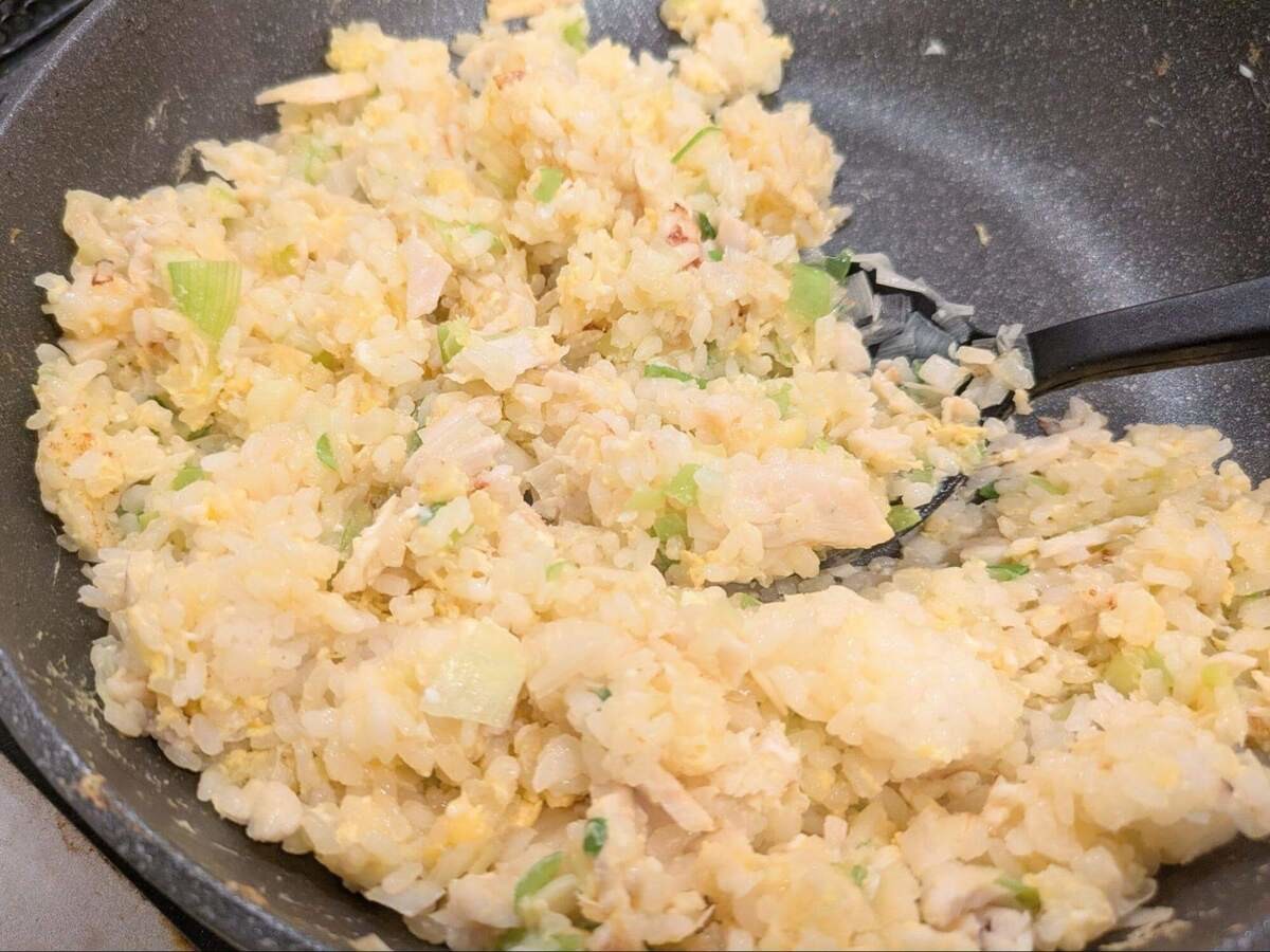 油をひいたフライパンに、溶きたまご2個分、ご飯、ネギ、サラダチキンの順に入れて中火で炒めます。