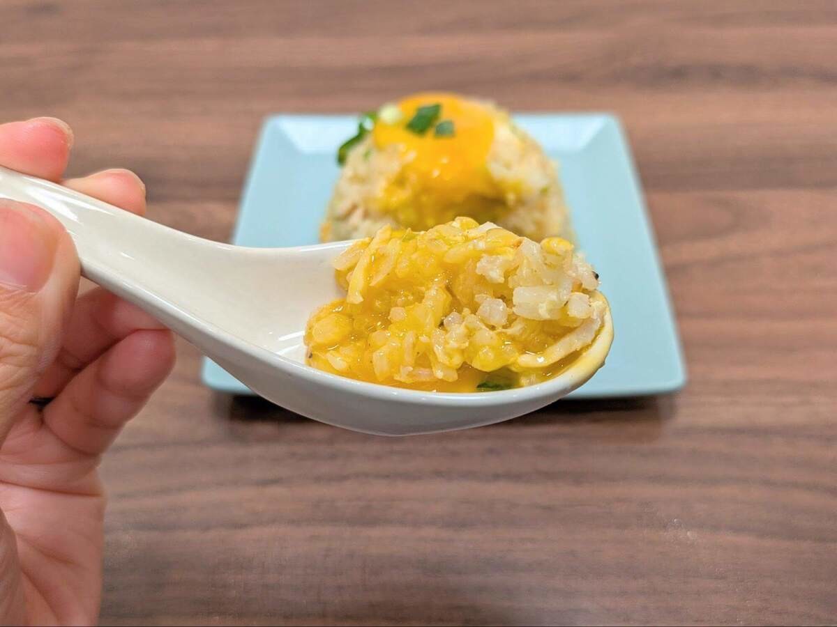 たまご入りのチャーハンに、さらに卵黄をのせる発想はとても新鮮でした。見栄えばっちり、家族も大満足。「また作って!」というリクエストがあったくらいです。