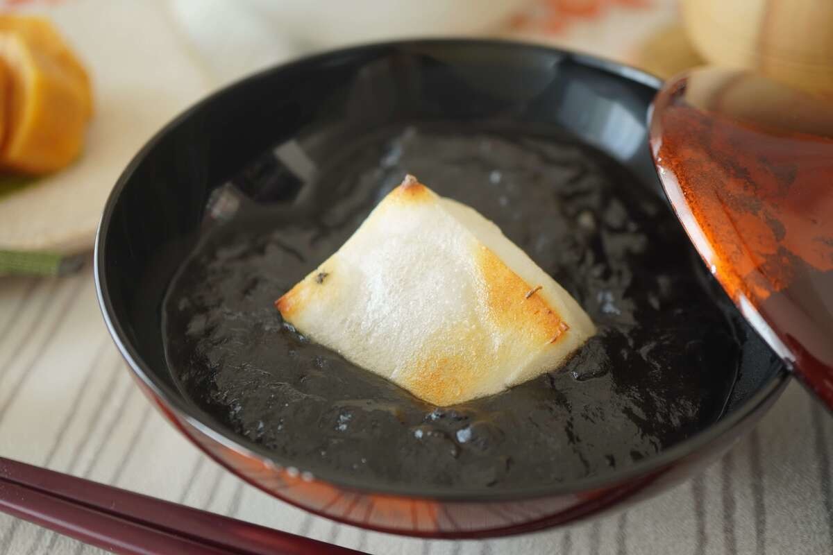 器に焼いた餅を入れ、熱々の汁を注いで出来上がりです。