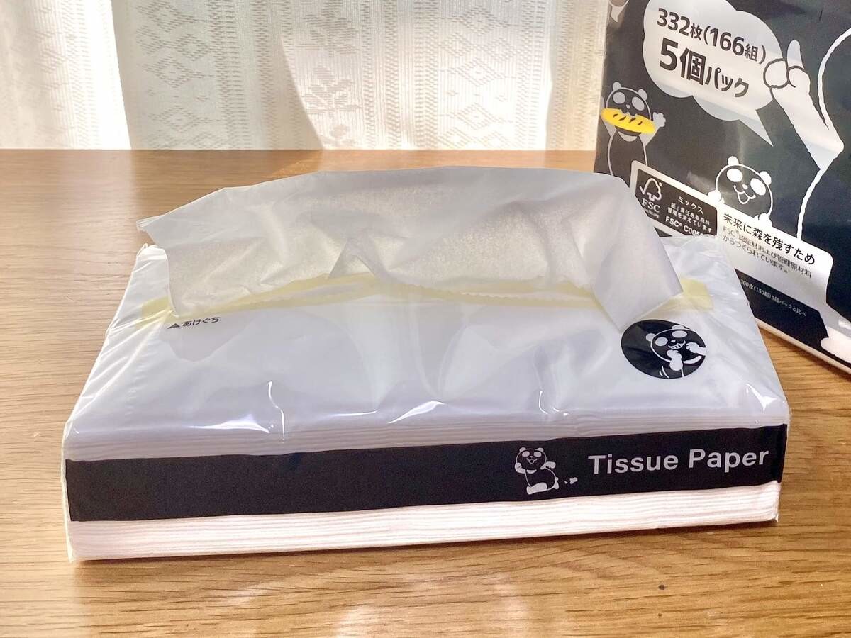 普段は150組×5個で217円ですが、こちらは価格はそのままで16組増量(約10.6%増)。派手なパッケージですが、中の柄は控えめでブラックパンダがワンポイント入る程度。インテリアにもなじみます。