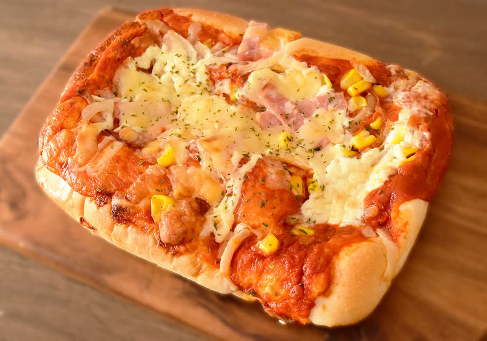 オニオン・コーン・ベーコン・チーズの4つの具材がたっぷりのっているピザパン。サイズ的には大きいとは思いますが「あふれた」とは感じないかも……。公式まんがを読むと、もちづきさんが「もう座布団じゃん!」と言ってますが、そこまで大きくはないですね。