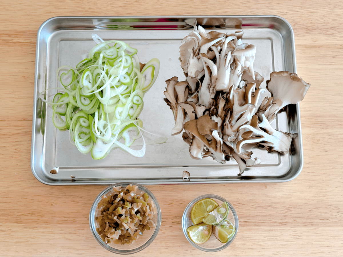 マイタケは小房に分けてひとくち大にし、長ネギは斜め薄切り、ザーサイは粗みじん切りにします。スダチは半分に切っておくと、仕上げにすぐ絞れて便利。