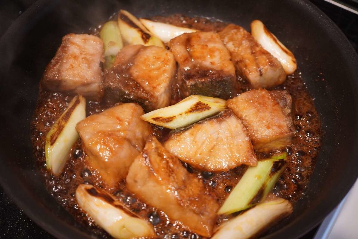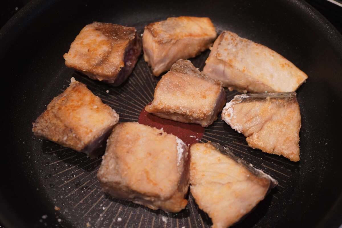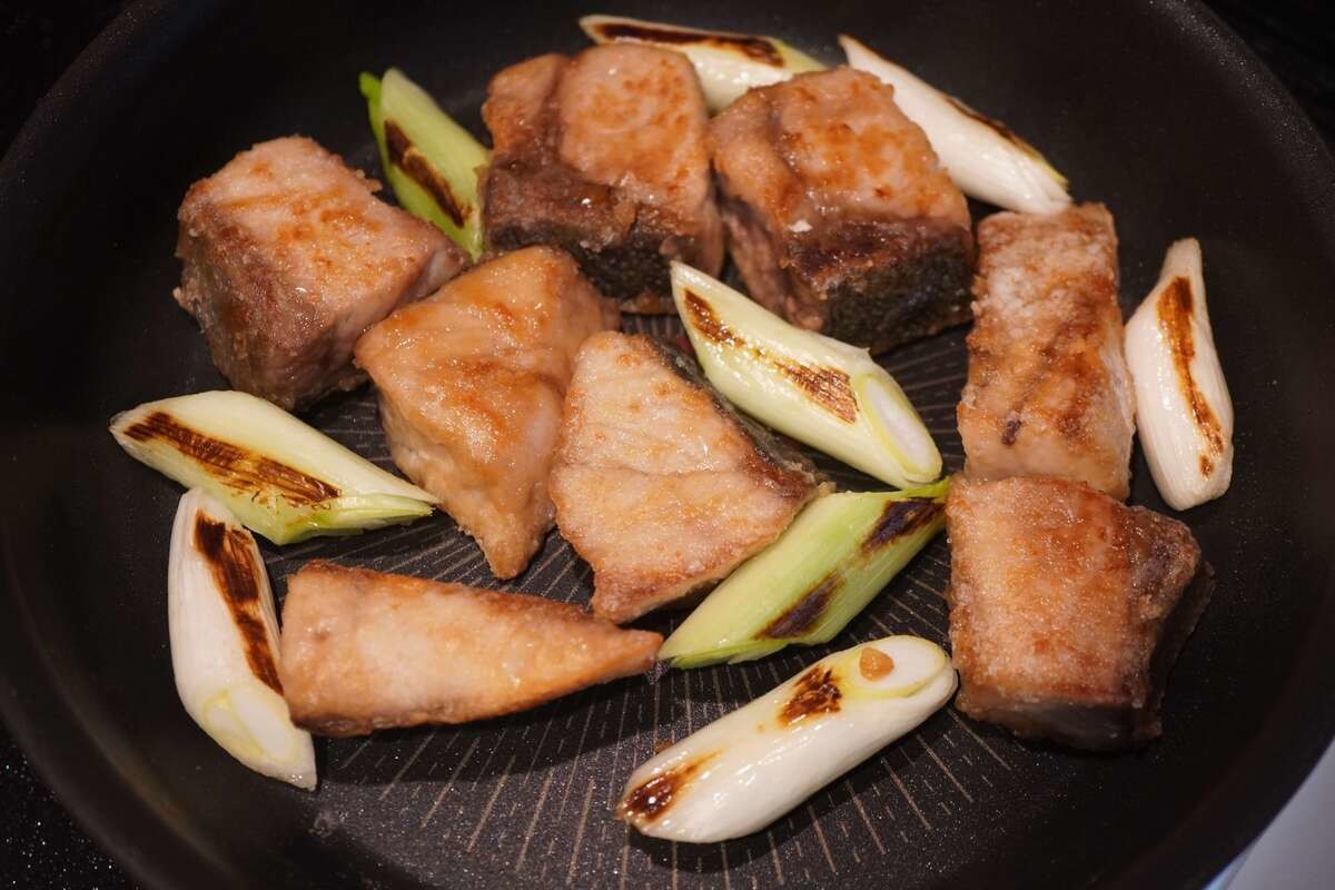 下ごしらえしたブリを入れ、両面がキツネ色になるまで焼き、一度取り出します。