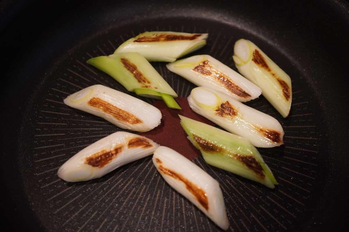 同じフライパンに長ねぎを入れ、あまり動かさずに焼き色がつくまで両面を焼きます。