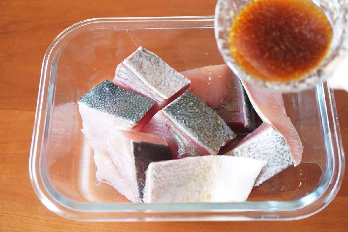 ボウルにブリを入れ、しょうゆとしょうが汁を混ぜ合わせたものを全体になじませます。