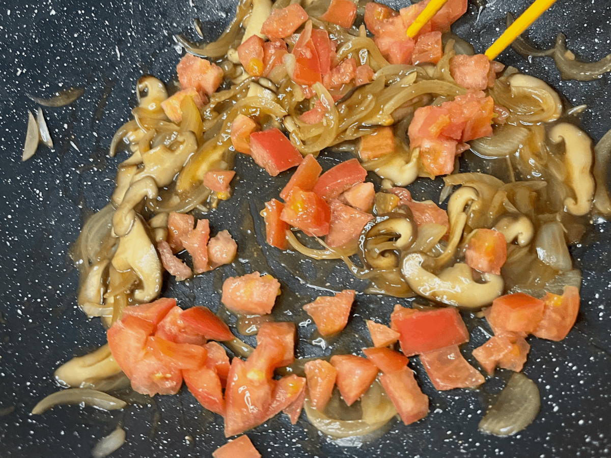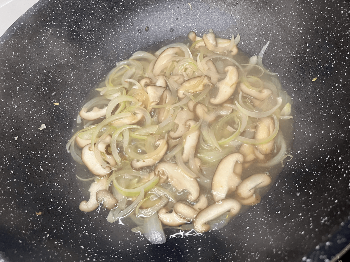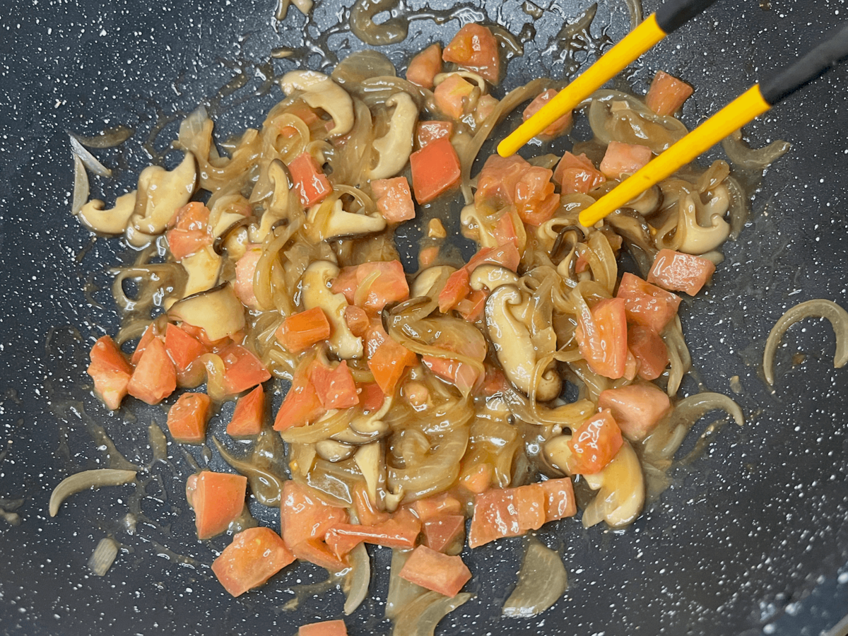 玉ねぎとしいたけを入れ、しんなりするまで炒めたら……。