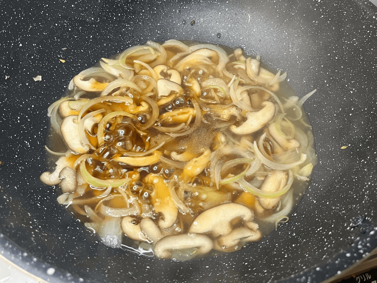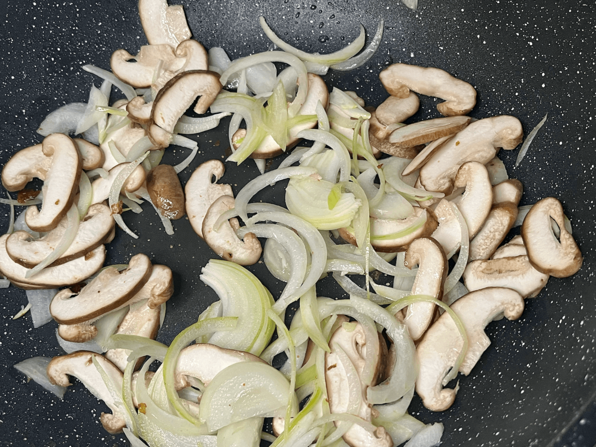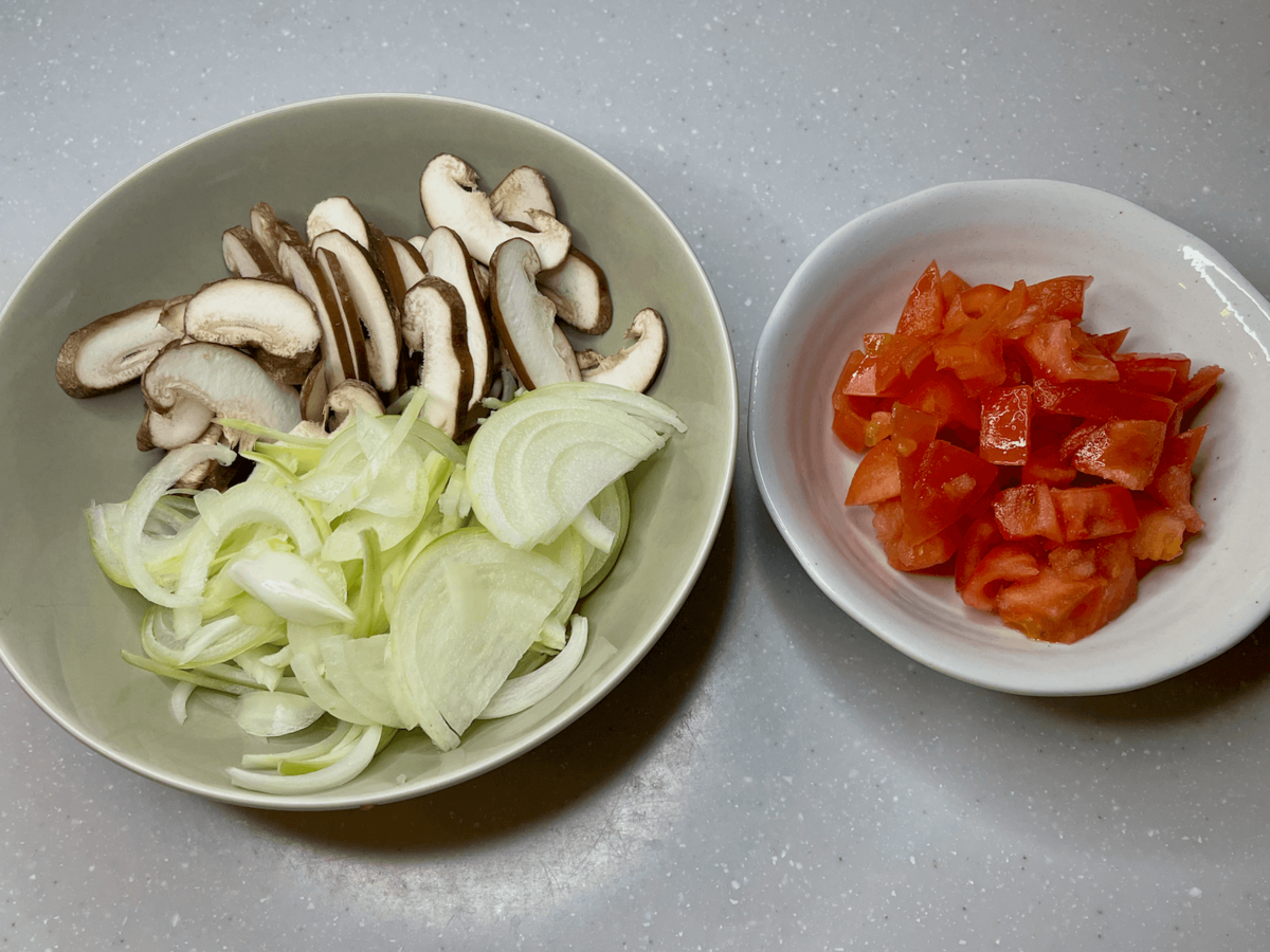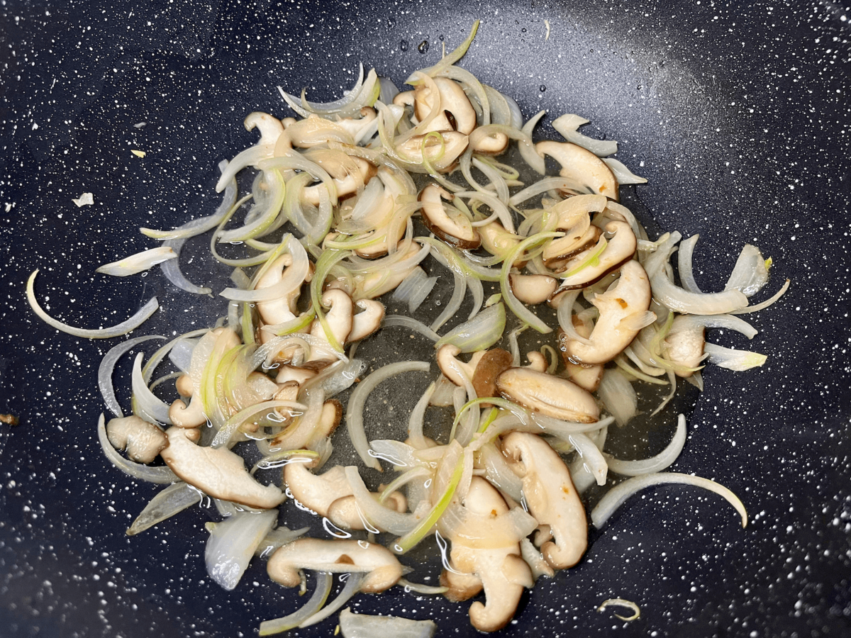 玉ねぎとしいたけを入れ、しんなりするまで炒めたら……。
