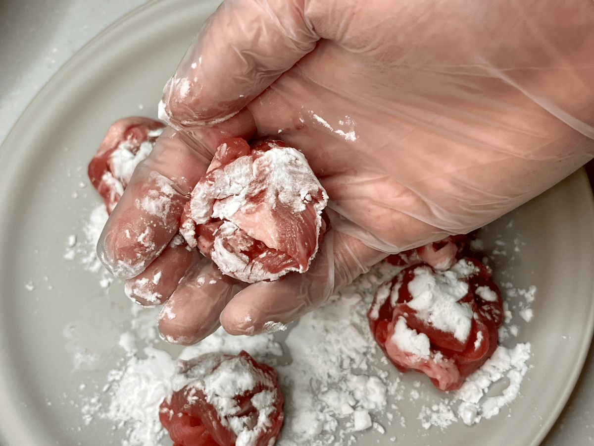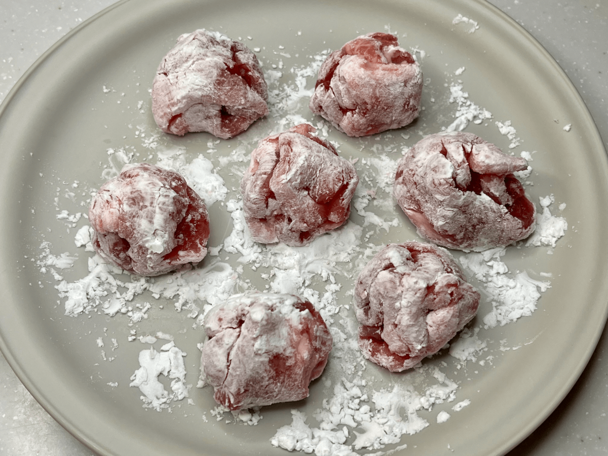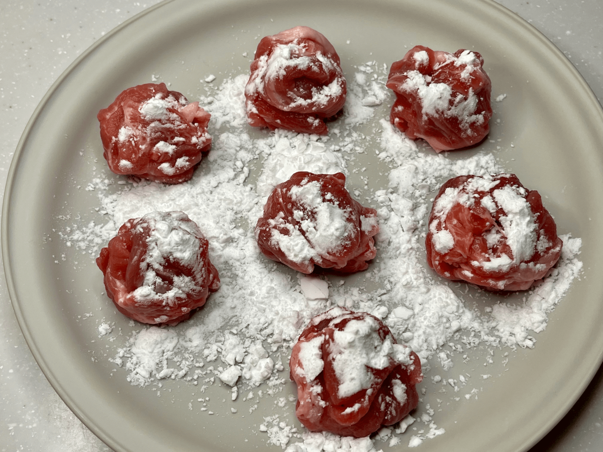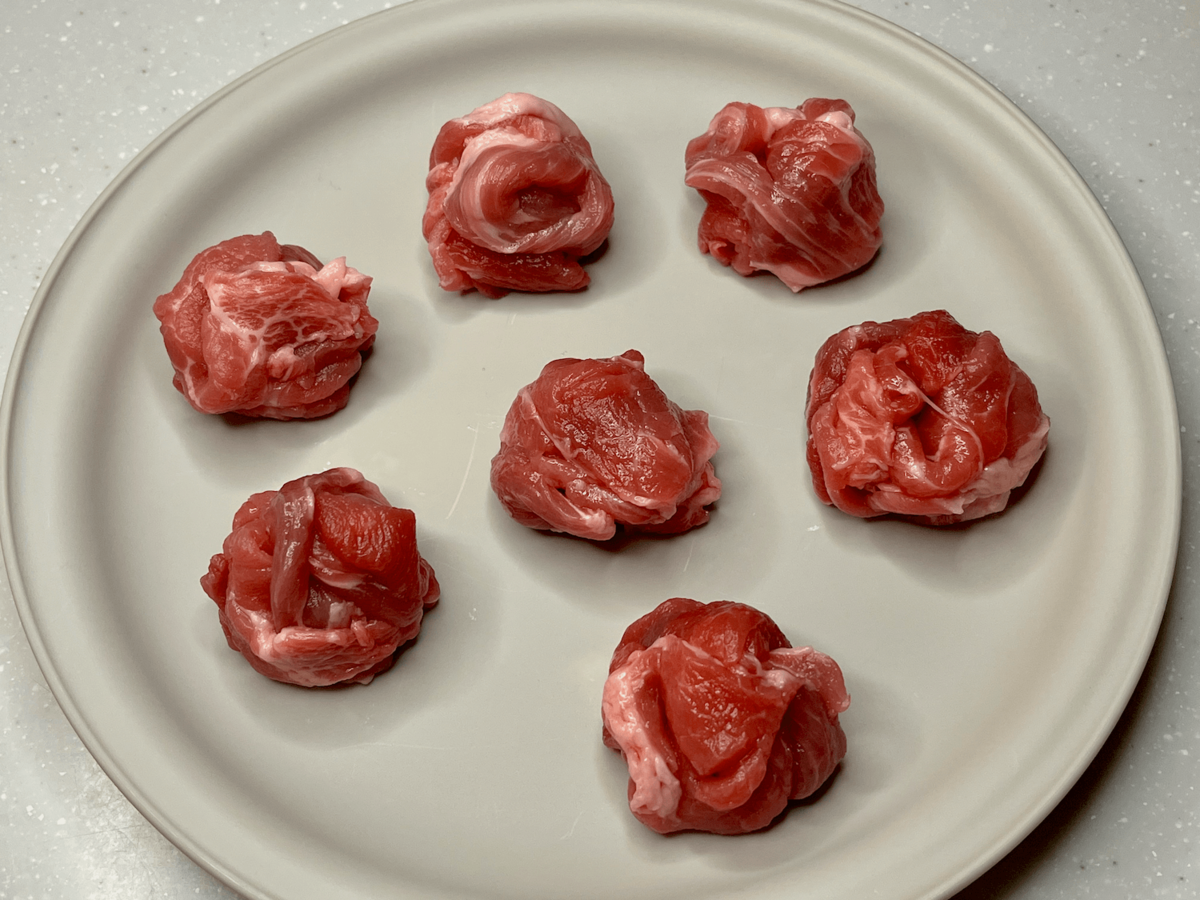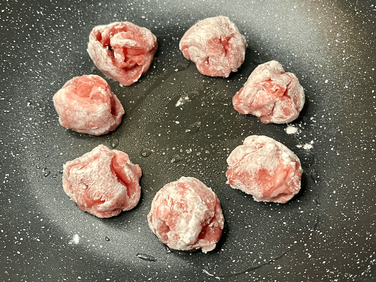豚こま切れ肉を8等分に分け、コロコロと丸めます。
