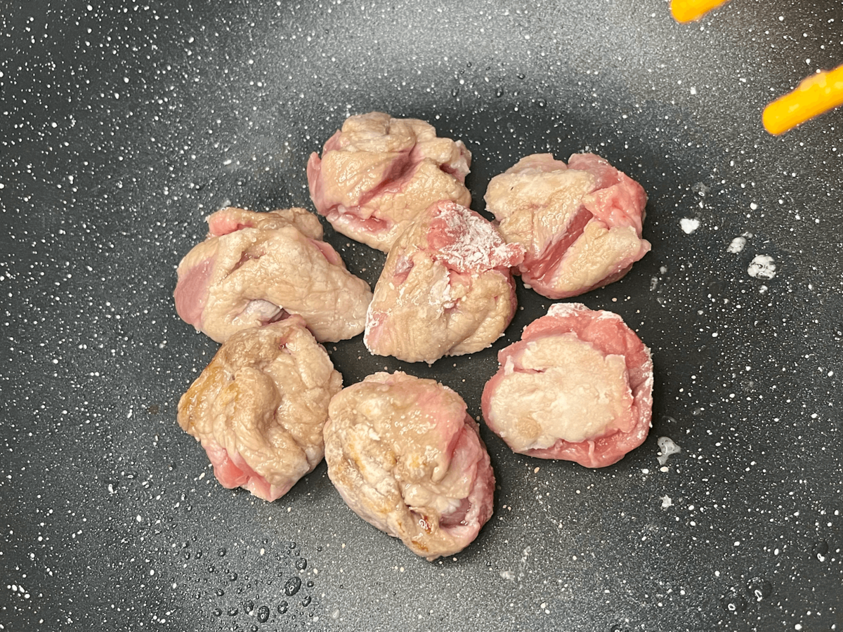 フライパンにサラダ油大さじ1/2を入れて中火で熱し、お肉を入れます。