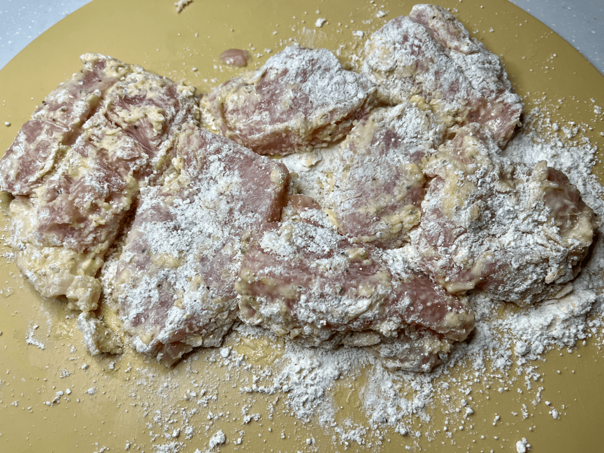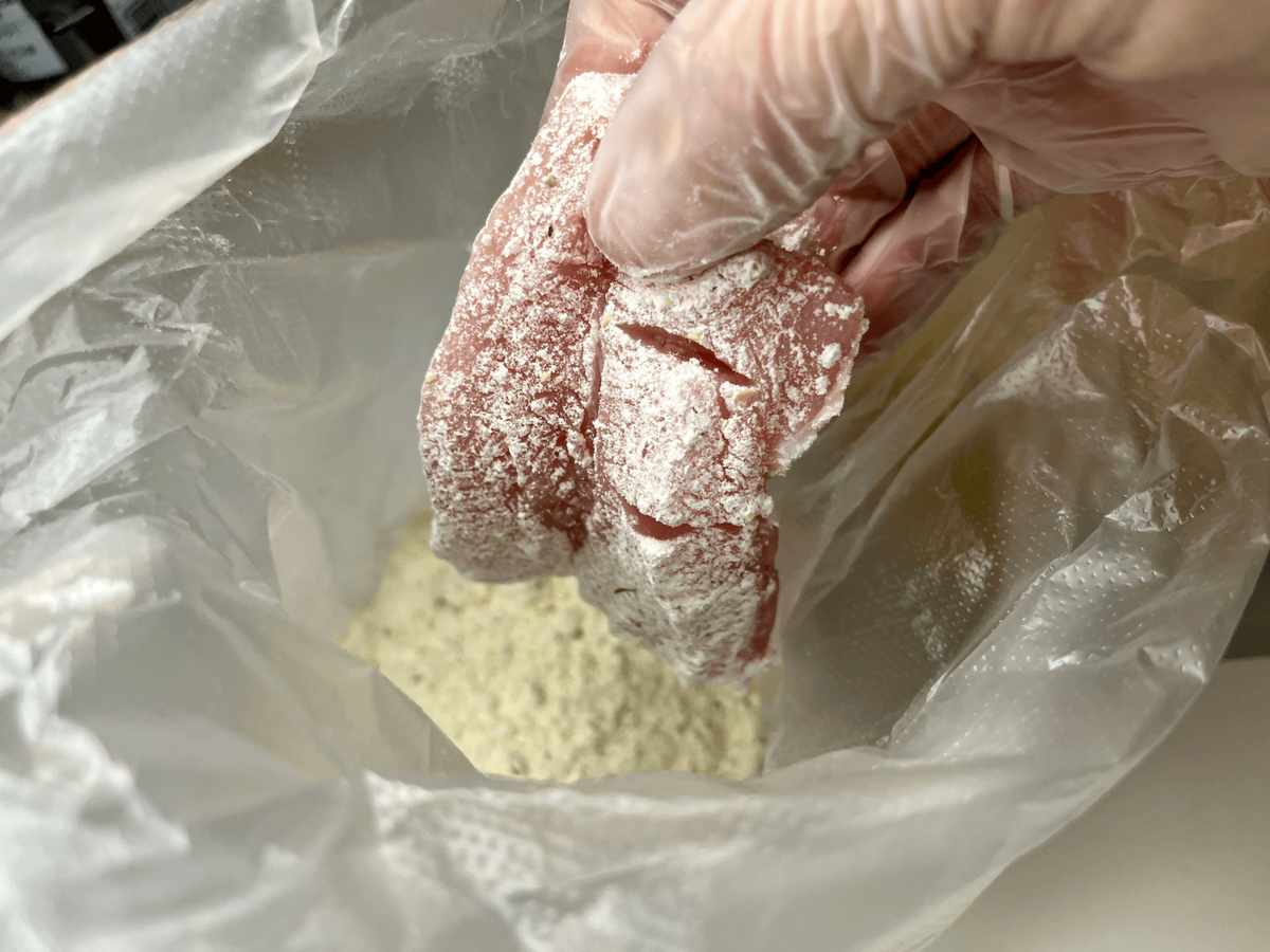 鶏むね肉に卵液→ミックス粉→卵液→ミックス粉……。