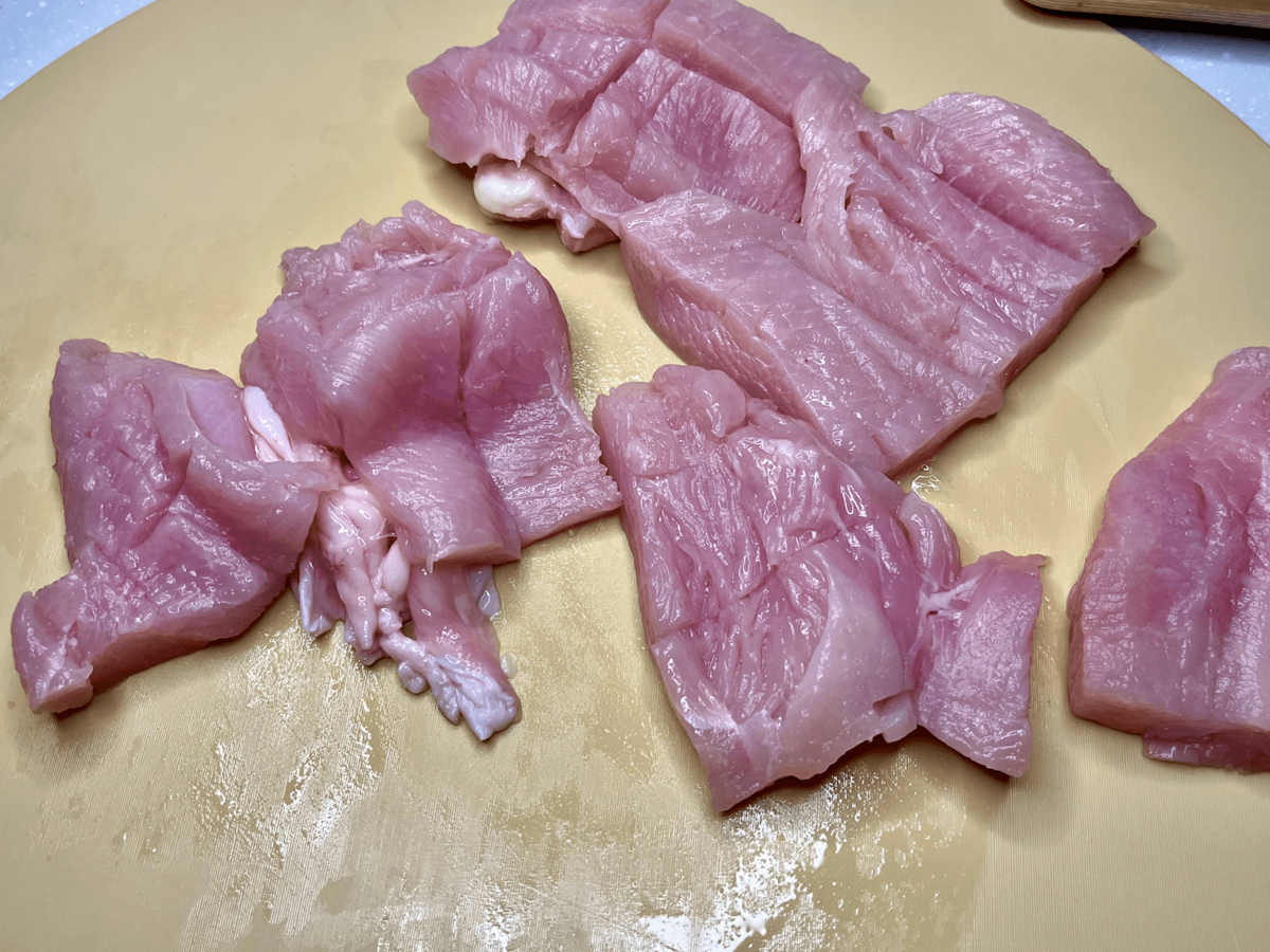 鶏むね肉を厚さが1cmくらいになるように開き……。