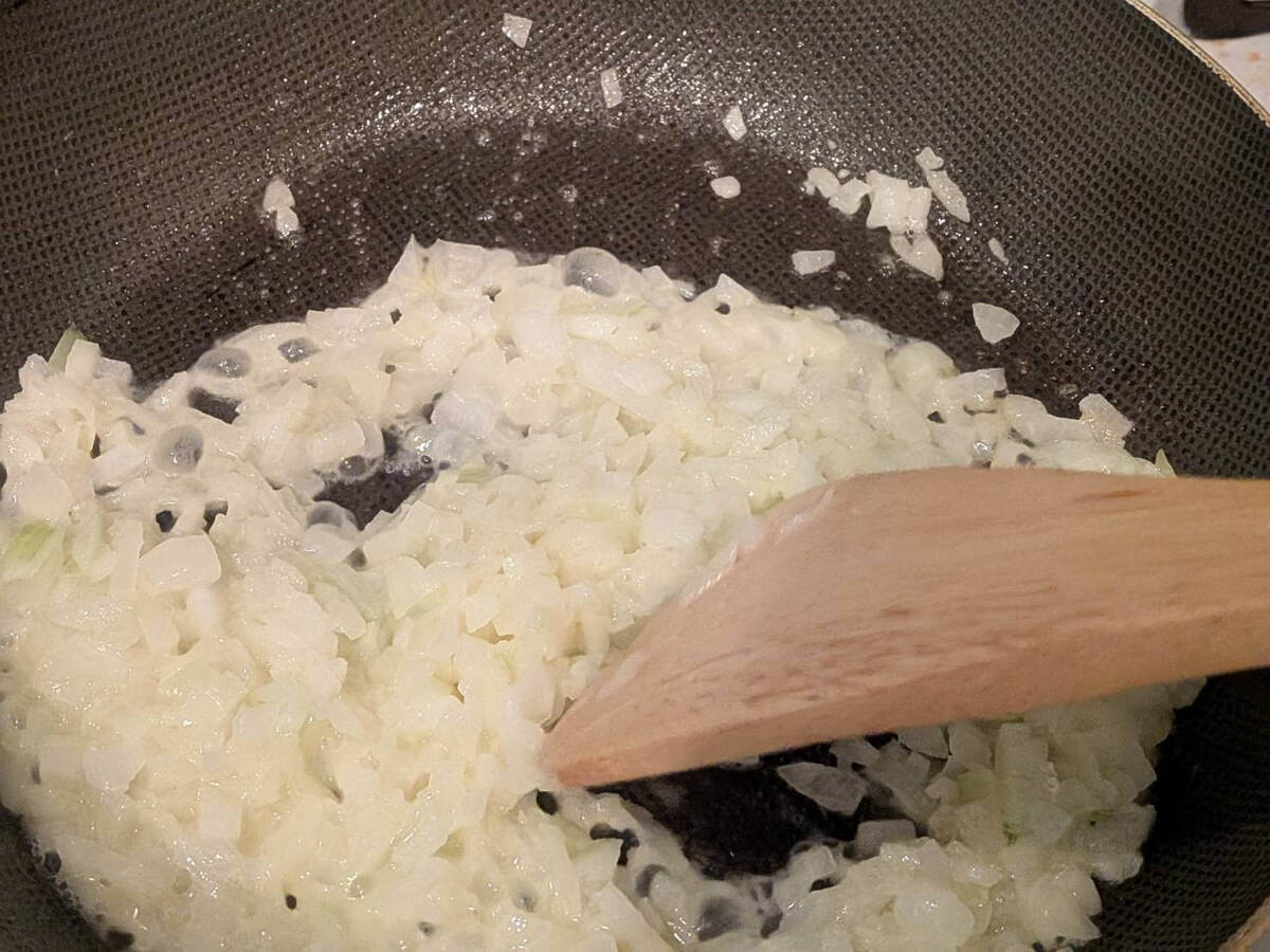 中火でバターが溶けたら、中〜弱火で玉ねぎがしんなりして少し茶色に色づくまで炒めます。