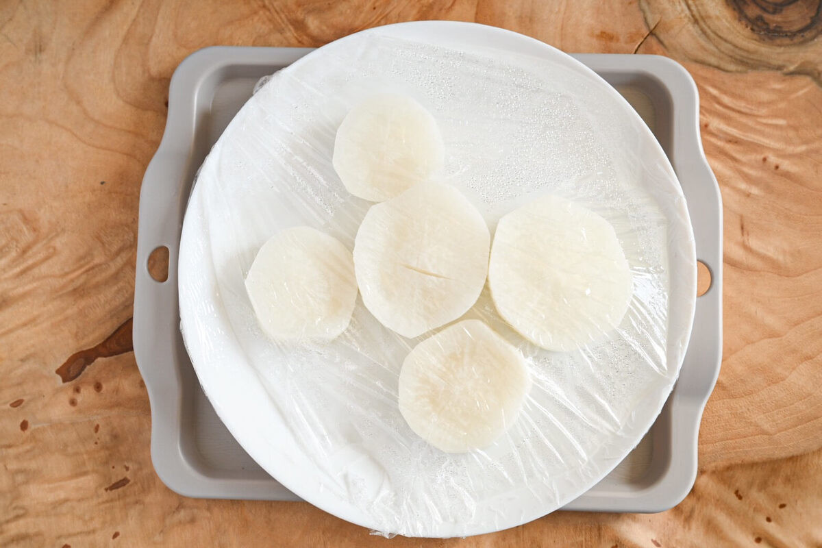 ラップを外し、大根が冷めるまでそのまま置いたら、下処理の完了です。