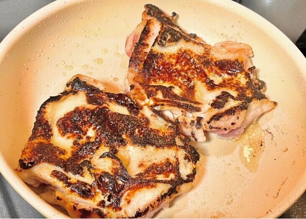 押し付けながら焼くことで、鶏もも肉の厚みが均等に焼かれてムラなく仕上がり、皮をパリッとさせられますよ。