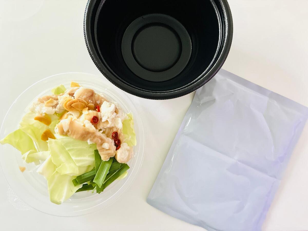 フタを開けると、仕切りの上にはもつと野菜、下にはパウチタイプのスープが入っています。