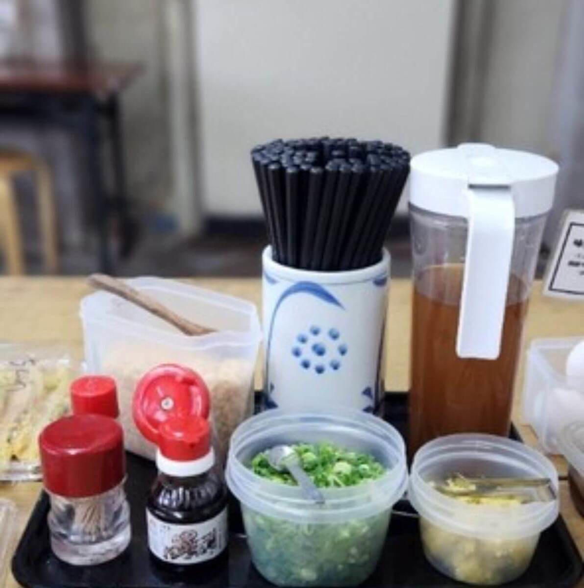 テーブルの上に出汁のポットと無料の薬味(ネギ、生姜、天かす、ゴマ、七味)が置かれています。