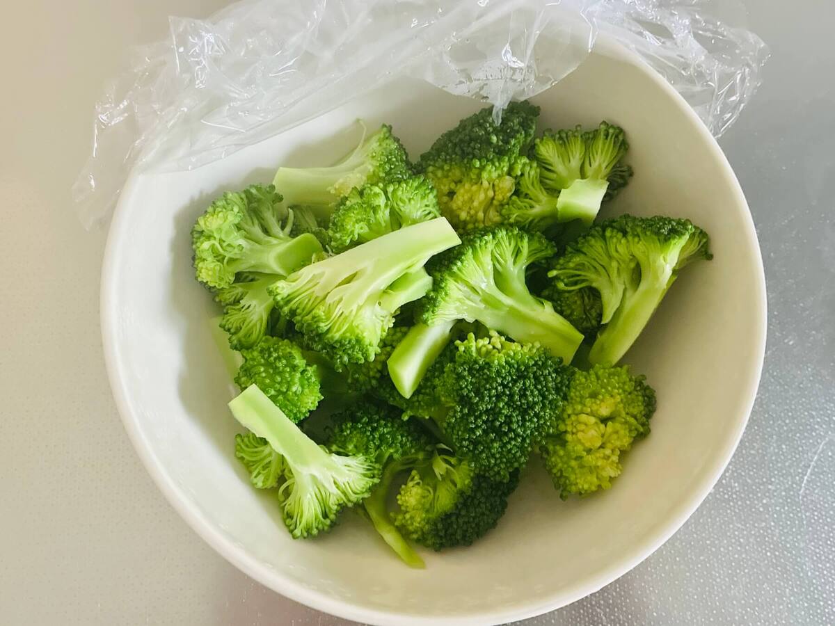 深めの耐熱容器にブロッコリーを入れ、ラップをふんわりかけて電子レンジ600Wで2分ほど加熱します。