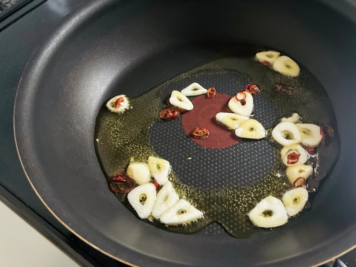 フライパンにオリーブオイルとにんにく、鷹の爪を入れて加熱し、香りを立たせます。